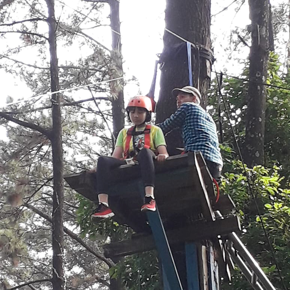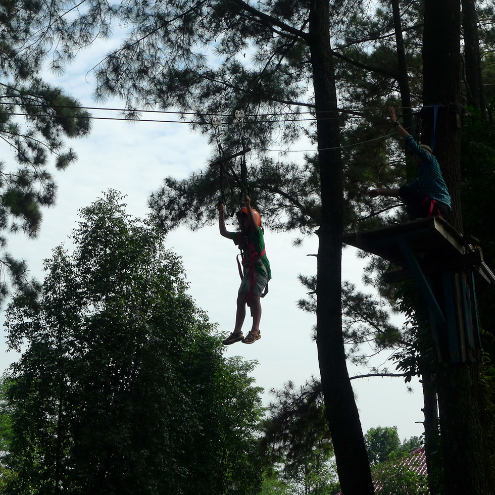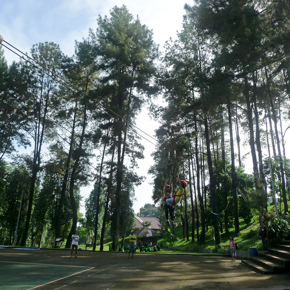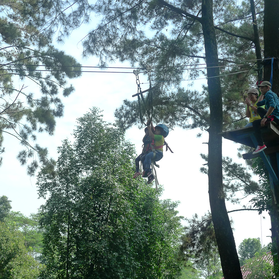 Dan diantara semua kegiatan yang dilakukan hari itu, yang menjadi favorit adalah kegiatan flying fox dan menangkap ikan. Di lokasi flying fox, anak ditempa keberaniannya untuk memanjat/menaiki tangga keketinggian sekitar 5 meter dan meluncur sepanjang 25 meter. Ada yang riang gembira menaiki anak tangga yang cukup curam dan meluncur dengan teriakan gembira dan tawa lepas, ada juga yang sampai diatas, berusaha mengumpulkan keberanian terlebih dahulu sebelum meluncur; dan di bawah sana teman-temannya berteriak-teriak memberikan dukungan semangat agar berani meluncur, ketika akhirnya meluncur, teman-temannya berlari menyambut gembira. Dan yang paling mengejutkan adalah keberanian luar biasa yang justru ditunjukkan oleh kelompok minion. Tanpa rasa takut dan ragu, mereka menaiki anak tangga, walaupun beberapa ada yang dibantu oleh kakak pendamping dan papanya, tapi mereka meluncur dengan tertawa riang. Waahhh….saluuuuut buat semua anak-anak hebat!!!